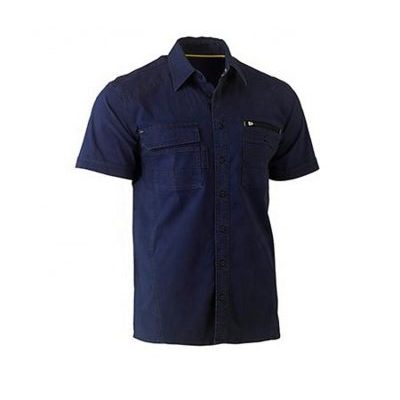 Classic workwear: this relaxed fit button-front work shirt features short sleeves, twin button-flap chest pockets & matching melamine buttons. it’s made of a sturdy, machine washable stretch twill blend for lightweight mobility with traditional toughness